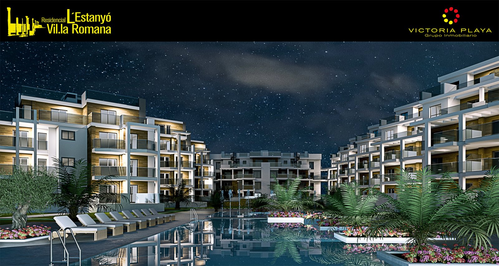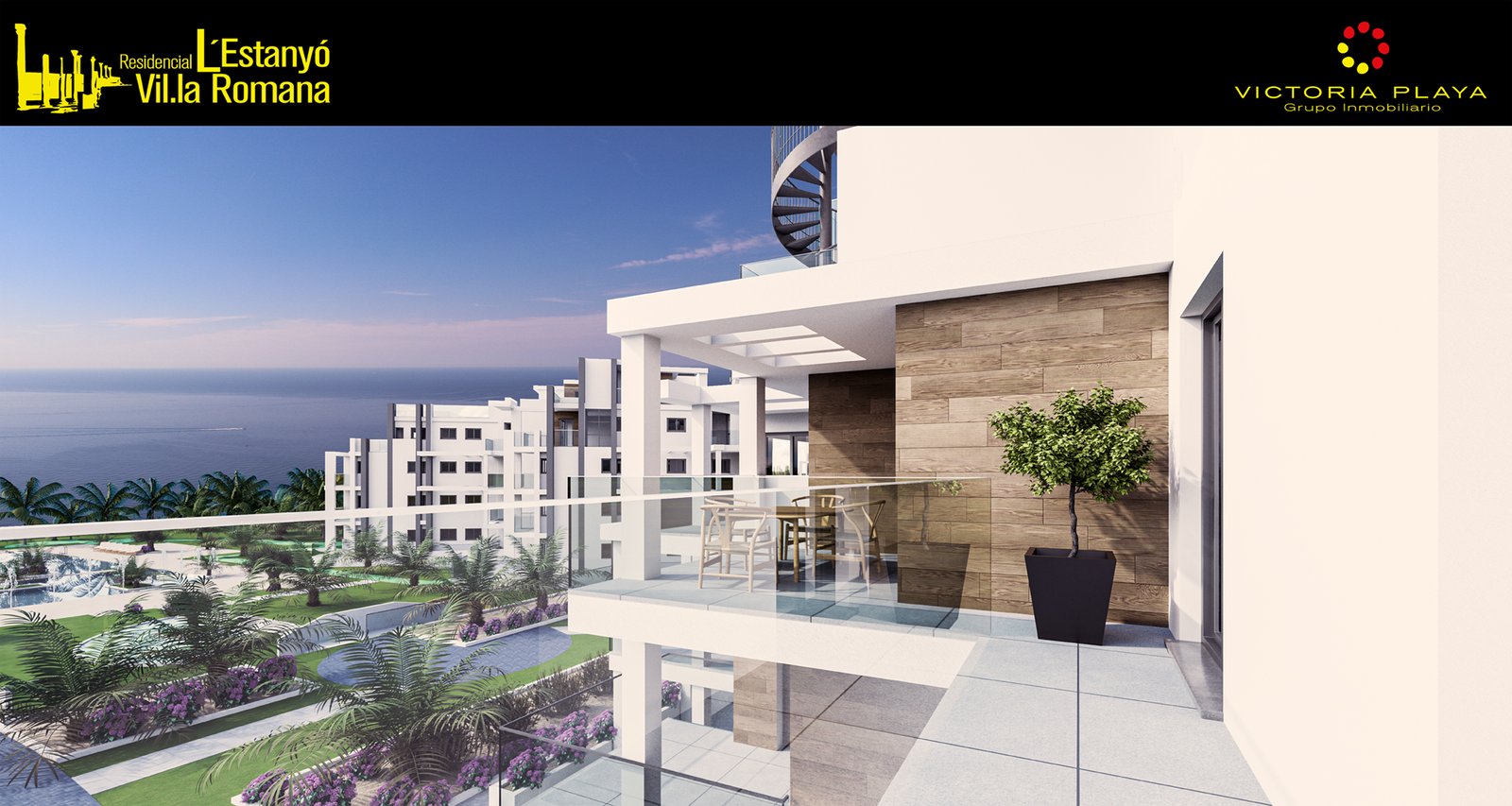 Residencial L’Estanyó Vil.Romana-Denia, composed of 100 modern homes, located on the FIRST LINE OF THE BEACH, a privileged environment, next to one of the best rated and considered beaches in Spain, with top qualities and sea views, which have extensive garden areas, children’s playground, underground parking and landscaped communal pool for adults and children.